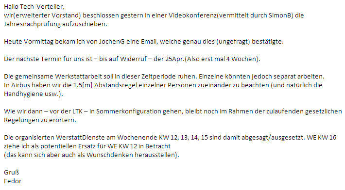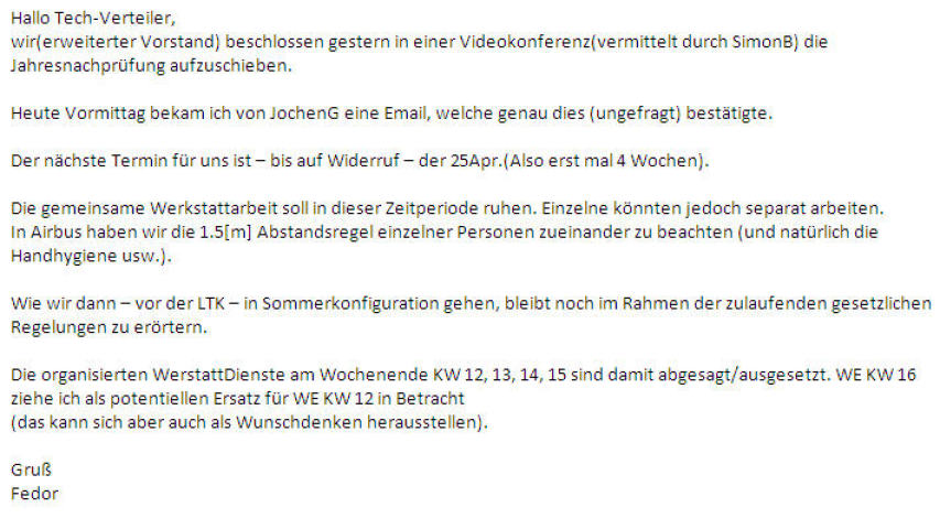 200318 | CoVID-19 -Aufschub aller Arbeiten um 4 Wochen. Siehe scresh an Tech-Verteiler unten. | |